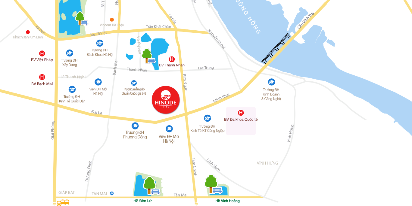 하노이 Hai Ba Trung 군 Minh Khai 201번지, 수도 남쪽의 핵심 관문에 위치한 Hinode City 는 교육 수준이 높고 인구 밀도가 높은 주거 지역일 뿐만 아니라, 현대적 인프라가 집중적으로 개발되는 우선 발전 구역에 위치해 있습니다. 이러한 이유로 Hinode City Minh Khai 는 고객과 부동산 투자자들로부터 이 지역의 새로운, 더욱 현대적이고 이상적인 고급 주거 상징으로 기대되고 있습니다.
