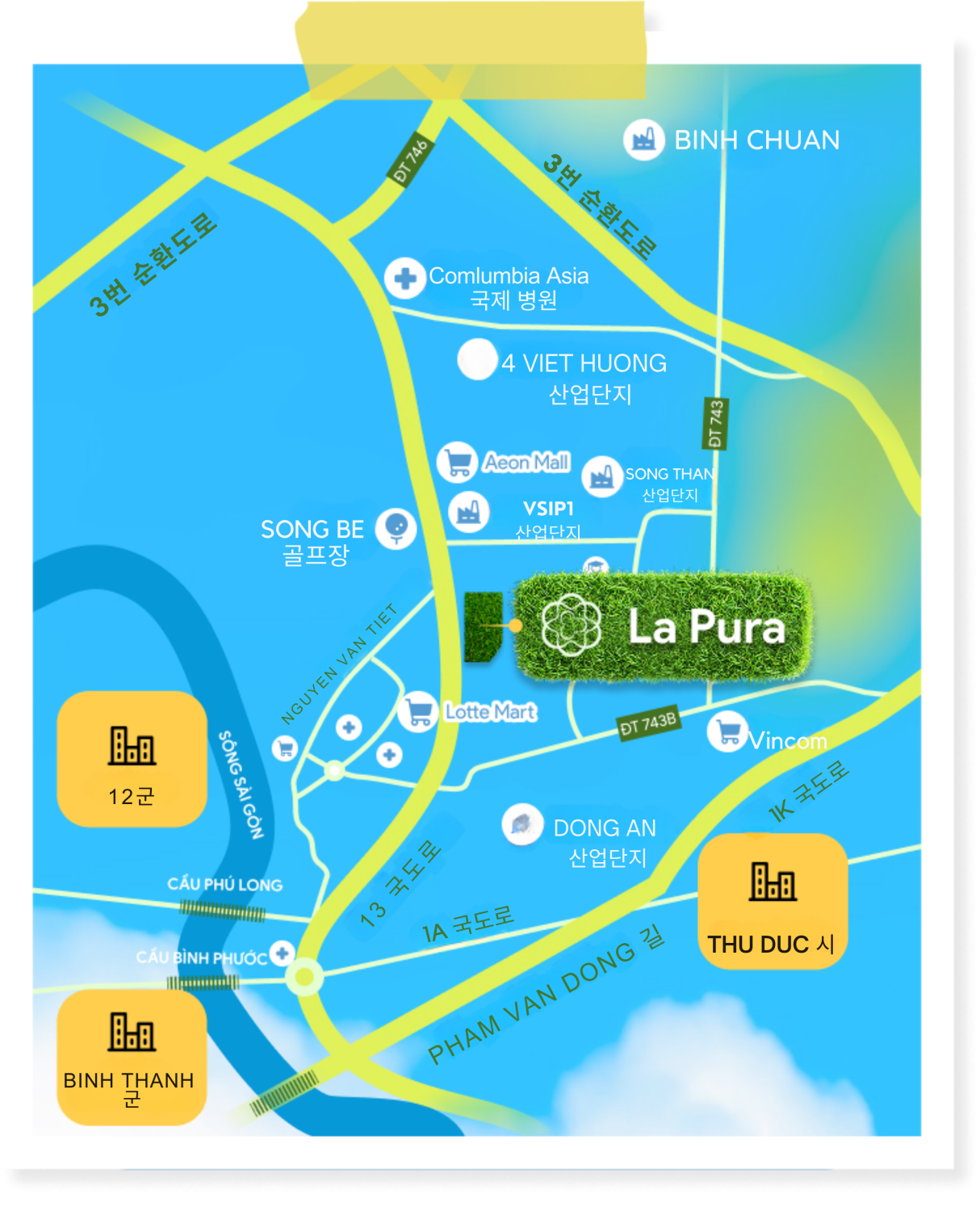 La Pura는 국도 13번 도로(현재 도로 폭 60m로 확장 중)에 300m에 달하는 넓은 정면을 보유하고 있다. 이 도로는 호치민시 동북부를 연결하는 핵심 간선도로이며, 빈호아를 연결하는 하노이 고속도로 또는 팜반동 도로와 유사한 역할을 한다. 또한 단지 인근에 위치한 3번 순환도로가 동남부 지역 간 이동을 더욱 용이하게 한다.