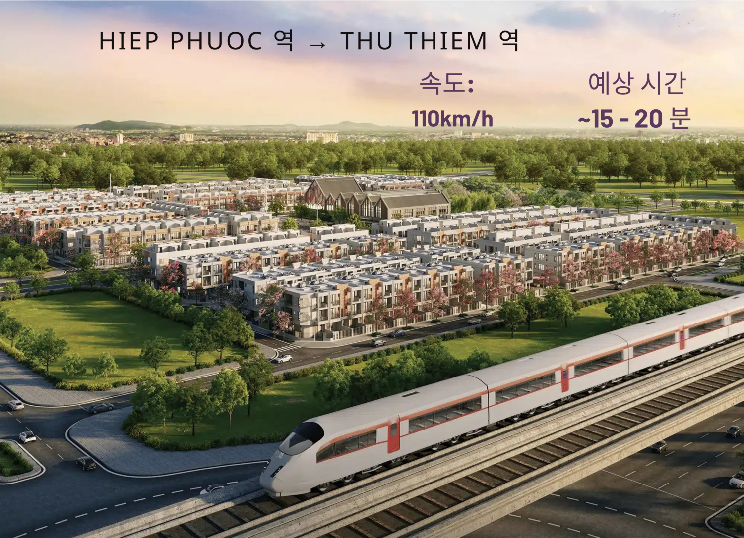 Spring Ville의 가장 큰 강점 중 하나는 투티엠–롱탄 철도 히엡프억역까지 단 0.8km 거리라는 점이다. 시속 110km 고속 노선을 통해 호치민 중심까지 약 15~20분이면 이동 가능해 주거와 업무를 연결하는 혁신적인 교통 환경을 제공한다.