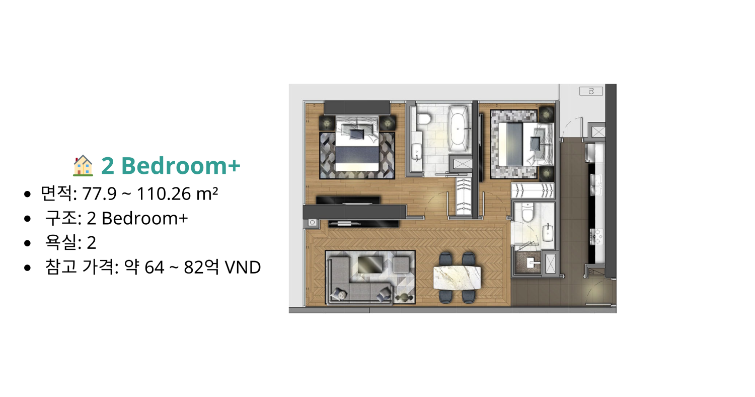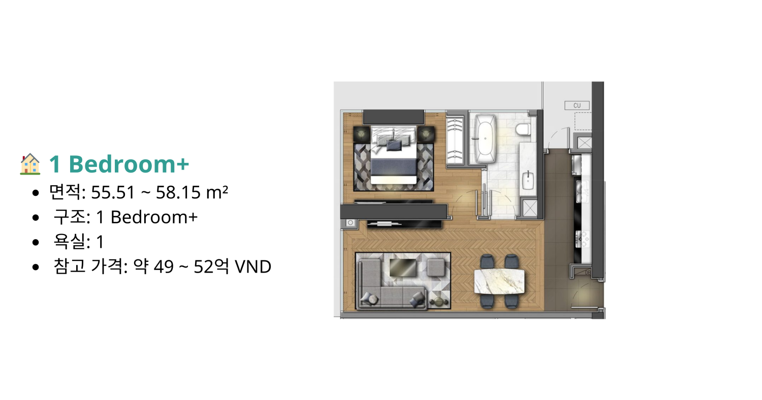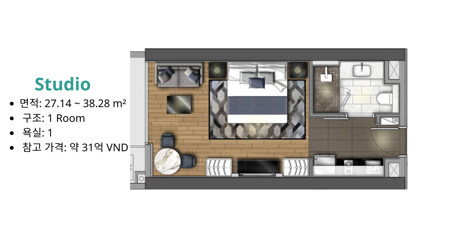 오픈형 구조 (Open Concept): 특히 Studio 및 1 Bedroom 타입은 거실과 주방을 연결한 오픈형 구조를 적용하여 공간 활용도를 높이고 넓은 개방감을 제공한다.