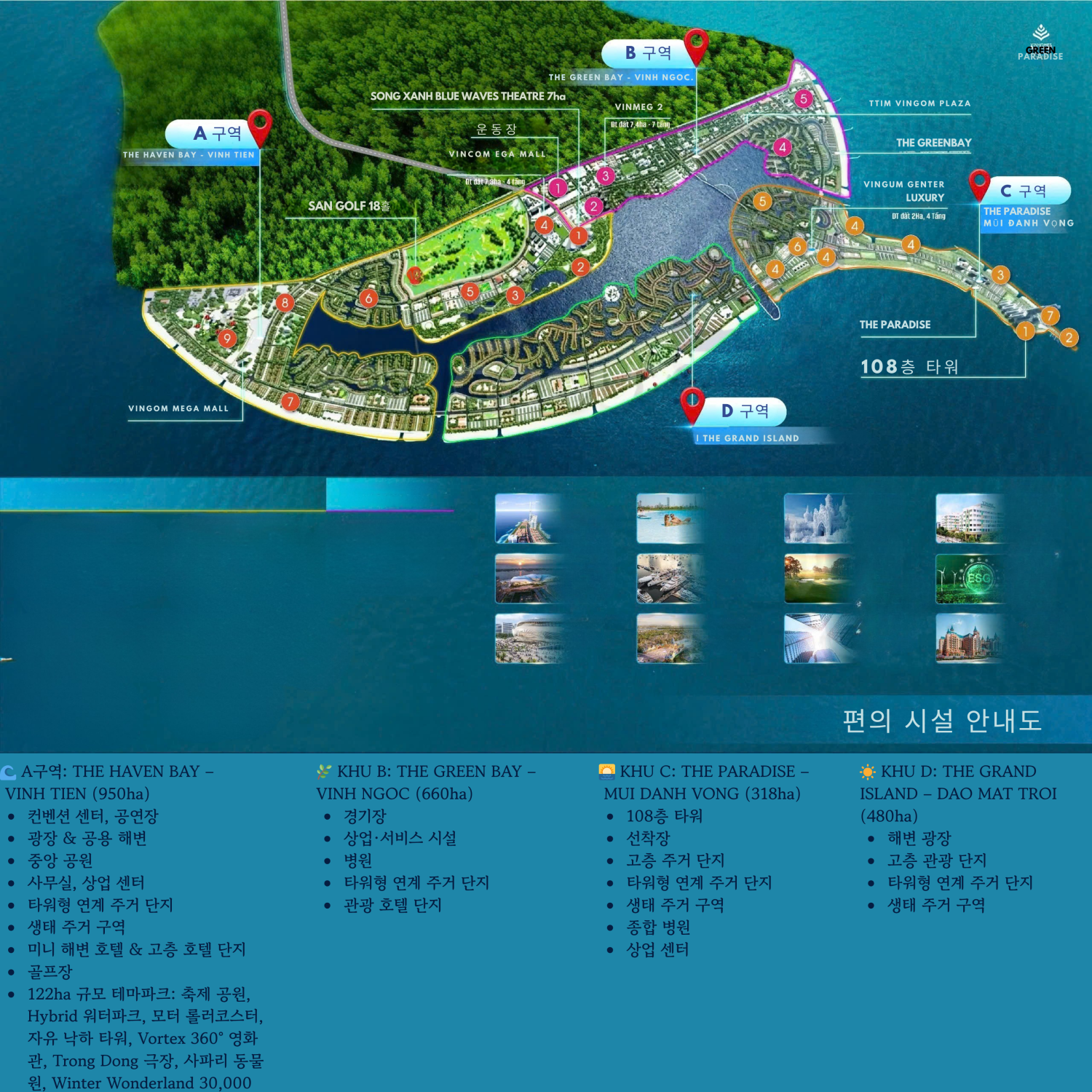 빈홈스 그린 파라다이스는 총 2,870헥타르 규모의 부지 위에서 국제적인 생활 수준을 새롭게 정의한다. 세계 최대 규모의 인공 라군 파라다이스 라군(443헥타르) 중심에 108층 랜드마크 타워가 우뚝 서며, 도시의 상징이 된다. 타이거 우즈 시그니처 골프장, 미국 1위 병원 클리블랜드 클리닉, 첨단 AI–IoT 스마트 기술, 그리고 독점 해상 풍력 에너지 시스템이 어우러져 있다. 건폐율은 단 30%에 불과하며, 나머지 공간은 자연과 휴식이 공존하는 “리조트형 생태 도시”로 설계되었다.