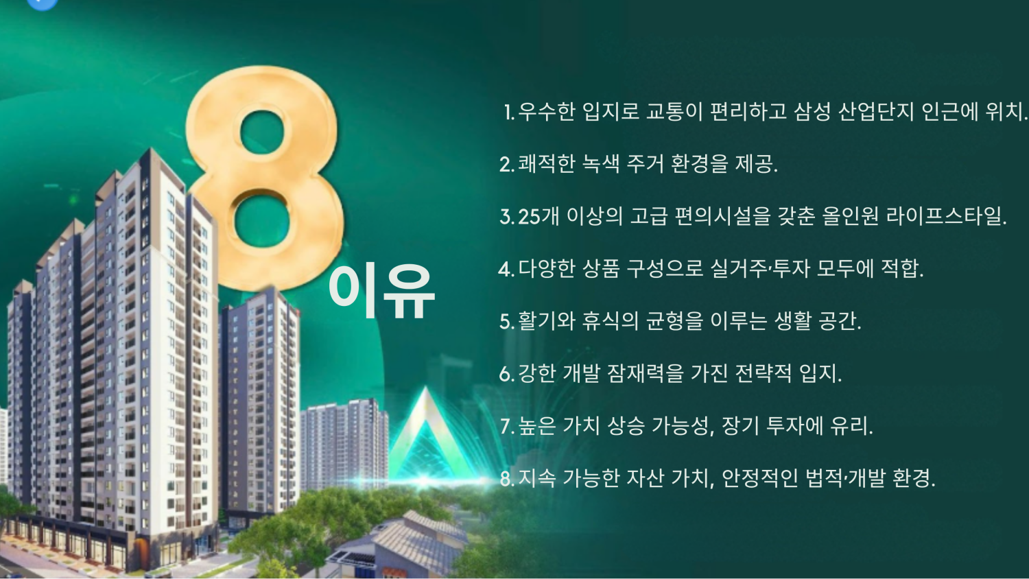이곳에서 입주민은 타이응우옌 최대 규모의 삼성 산업단지에 쉽게 접근할 수 있으며, 하노이·타이응우옌·박닌·박장·빈푹 등 인근 주요 도시로도 신속하게 이동할 수 있다.