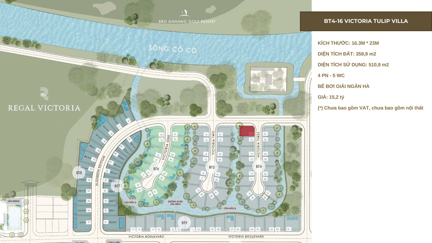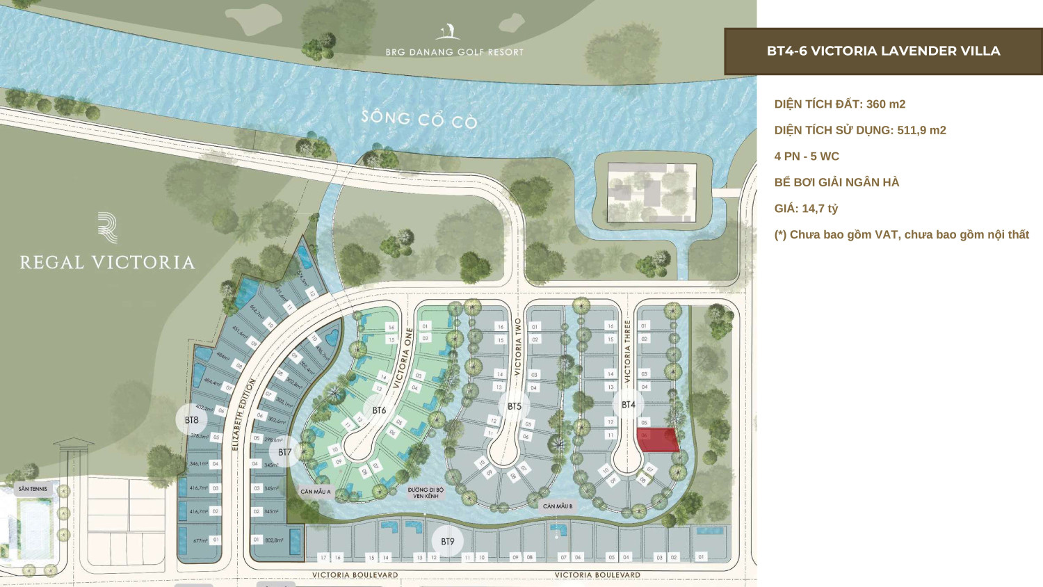 북쪽은 FPT City, 서쪽과 남쪽은 One World Regency와 맞닿아 있으며, 동쪽은 Cổ Cò 강 조망과 다낭의 두 개 국제 골프장을 한눈에 담는 특권적인 프런티지를 갖추고 있습니다.